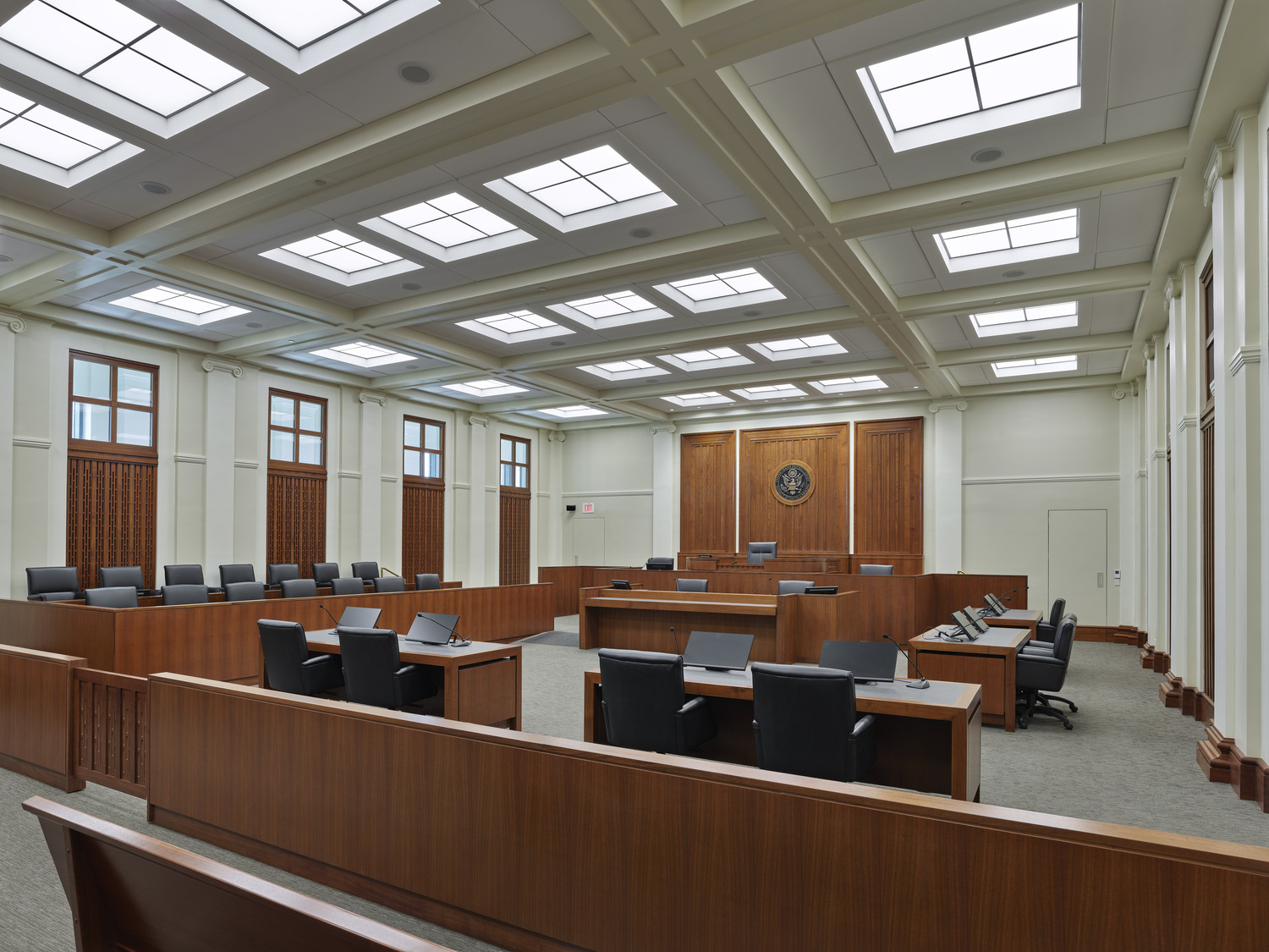 This new, 193,000 sq ft courthouse features seven courtrooms, nine judges’ chambers, court offices, a jury assembly, and support spaces. It also includes secure office and detention space for the U.S. Marshals Service. Additional spaces include the U.S. Probation Office, U.S. Attorney’s Office, and a Federal Public Defender’™s Office. The concrete frame building features a basement with 70 enclosed parking spaces, six above-grade levels, and a mechanical penthouse. This project is seeking LEED v4 Gold and SITES Silver ratings.